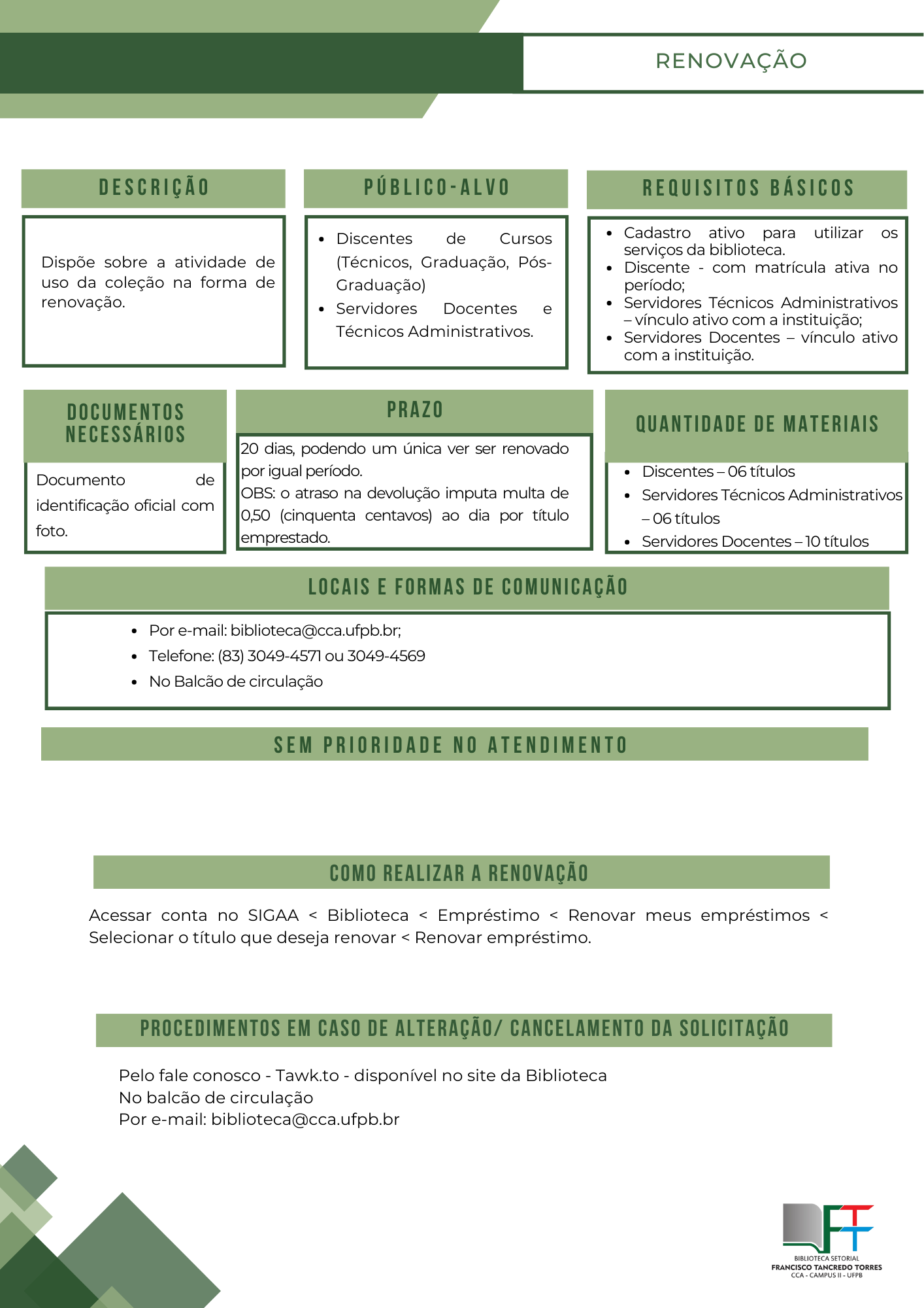 Descrição da imagem: Imagem com fundo branco de detalhes verde claro e verde escuro. Título: Renovação. Logo abaixo quadros com as seguintes informações: Descrição - dispõe sobre a atividade de uso da coleção na forma de renovação. Público alvo - discentes de cursos (técnicos, graduação, pós- graduação), servidores, docentes e técnicos administrativos. Requisitos básicos - cadastro ativo para utilizar os serviços da biblioteca, discente com matrícula ativa no período, servidores técnicos administrativos com vínculo ativo com a instituição, servidores docentes com vínculo ativo com a instituição. Documentos necessários - documento de identificação oficial com foto. Prazo - 20 dias, podendo uma única vez ser renovado por igual período. OBS: o atraso na devolução imputa multa de 0,50 (cinquenta centavos) ao dia por título emprestado. Quantidade de materiais - discentes 06 títulos, servidores técnicos administrativos 06 títulos, servidores docentes 10 títulos. Locais e formas de comunicação: Por e-mail: biblioteca@cca.ufpb.br; Telefone: (83) 3049-4571 ou 3049-4569; e no balcão de circulação. Logo abaixo está escrito: Sem prioridade no atendimento. Como realizar a renovação: Acessar conta no SIGAA ≤ Biblioteca < Empréstimo < Renovar meus empréstimos < Selecionar o título que deseja renovar < Renovar empréstimo. Procedimentos em caso de alteração/ cancelamento da solicitação: Pelo fale conosco - Tawk.to - disponível no site da Biblioteca, no balcão de circulação e por e-mail: biblioteca@cca.ufpb.br. No rodapé está a logo da biblioteca setorial Francisco Tancredo Torres.