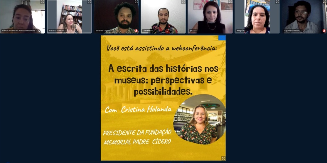 Nos ritos finais de sua fala, ela tratou de como está sendo e de como vai ser a situação dos museus no pós-pandemia. Segundo a palestrante, o Brasil tem mais de 3.000 mil museus, e tanto aqui como em outras partes do mundo, eles não chegaram ao público de outra maneira que não a presencial. Comentou sobre suas ações em levar, de forma virtual, o museu Padre Cícero ao público, além de outros exemplos. Para ela, a virtualidade não é o futuro dos museus, porque há o gosto de estar ali, ter a experiência, ver o objeto, ter as suas dimensões. Mas que eles vão entrar no universo virtual com a pandemia, mas isso é uma tendência a ser feita com cuidado metodológico e teórico. Essas duas precauções devem ser observadas tanto no modo presencial quanto no virtual, ela acrescentou. Agradeceu a todos os presentes, e se dispôs a responder eventuais perguntas. Apresentou, nesse fim, o catálogo referente ao memorial Padre Cícero, o que despertou curiosidade, elogios e vontade de conhecer o museu.