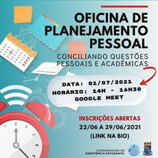 A Coordenação de Assistência Estudantil, por meio do Serviço de Psicologia, realizará a “Oficina de planejamento pessoal: conciliando questões pessoais e acadêmicas”.