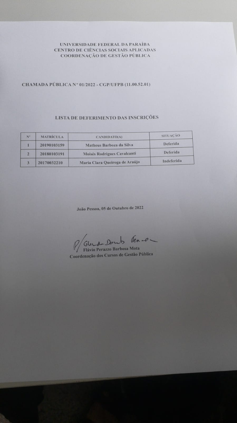 A Coordenação do Curso de Bacharelado em Gestão Pública torna pública a LISTA DE DEFERIMENTO DAS INSCRIÇÕES para chamada pública de oferta de estágio não-remunirado conforme chamada pública nº 01/2022 CGP/UFPB.