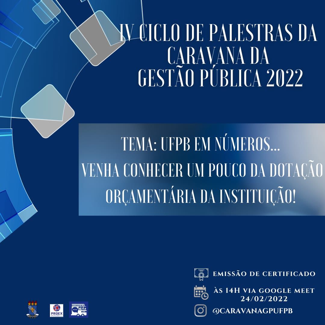 Notícias IV Ciclo de Palestras da Caravana de Gestão Pública 2022 Tweet publicado: 23/02/2022 10h29, última modificação: 24/02/2022 09h29 Quando: dia 24/02/2022 Horário: 14hs Local: https://meet.google.com/ctx-nkwt-ovb?pli=1&authuser=0