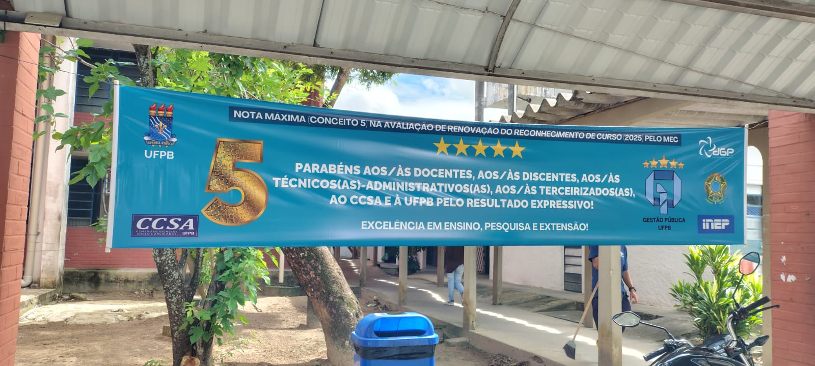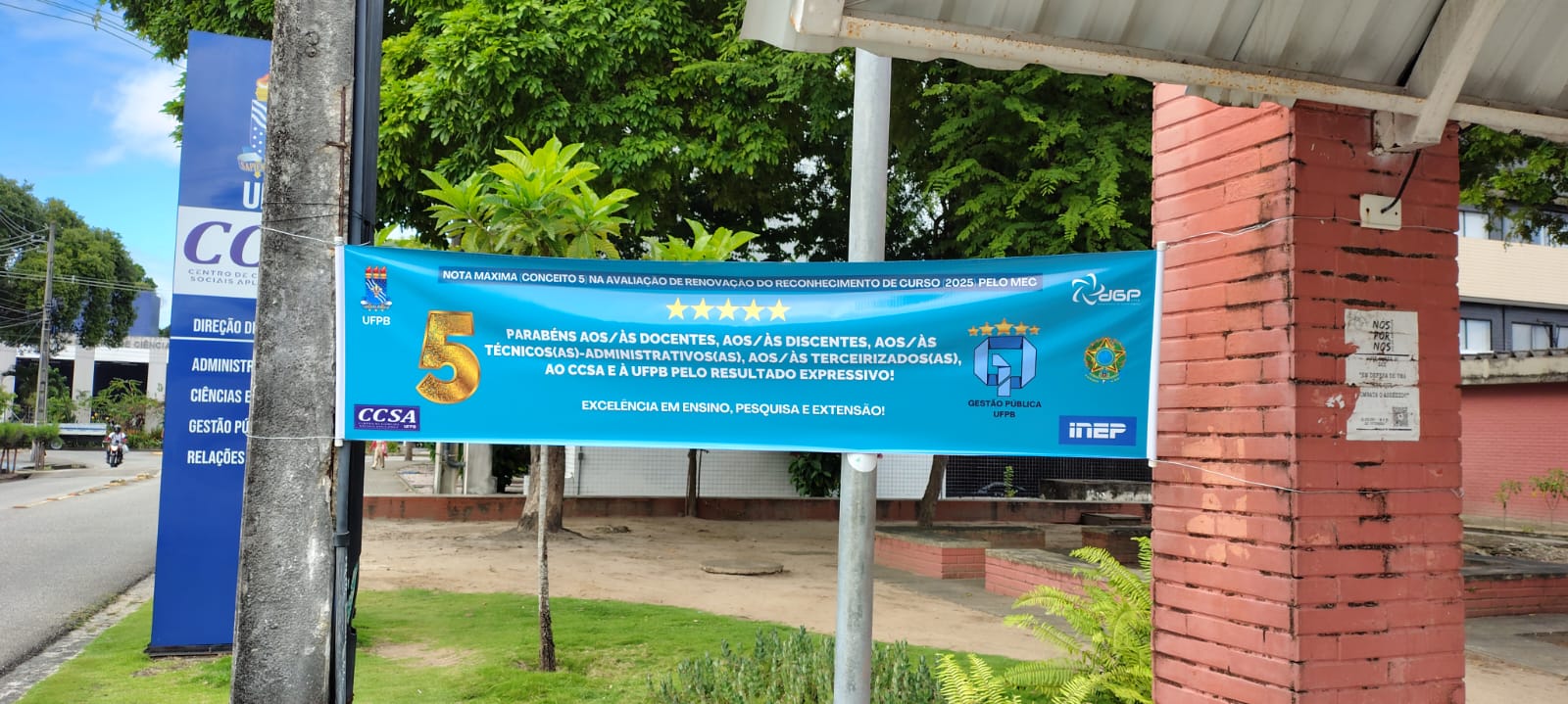Nesta sexta-feira, 25/07, foi realizada a instalação das faixas alusivas ao Conceito Máximo (Nota 5) do curso de Bacharelado em Gestão Pública pelo Ministério da Educação (MEC), uma iniciativa e parceria entre o Departamento de Gestão Pública (DGP/CCSA) e a Coordenação do Bacharelado em Gestão Pública (CCGP/CCSA), do Centro de Ciências Sociais Aplicadas (CCSA) da Universidade Federal da Paraíba (UFPB)