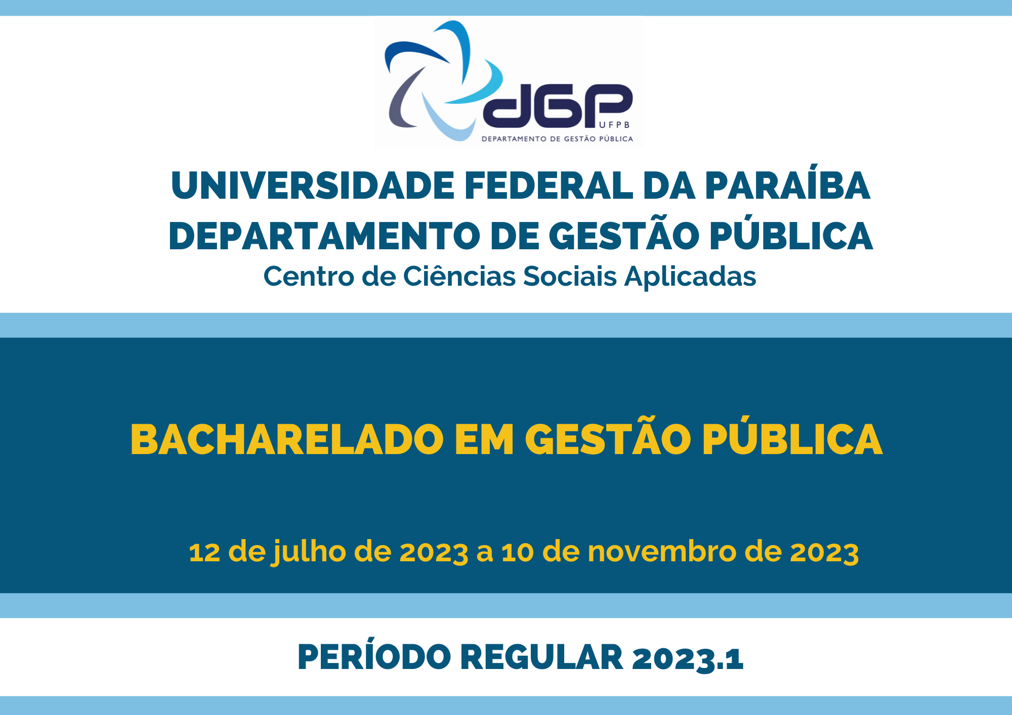 O Departamento de Gestão Pública torna pública a oferta de disciplinas do Bacharelado em Gestão Pública para o período regular 2023.1, com início em 12 de julho de 2023 e término em 10 de novembro de 2023.