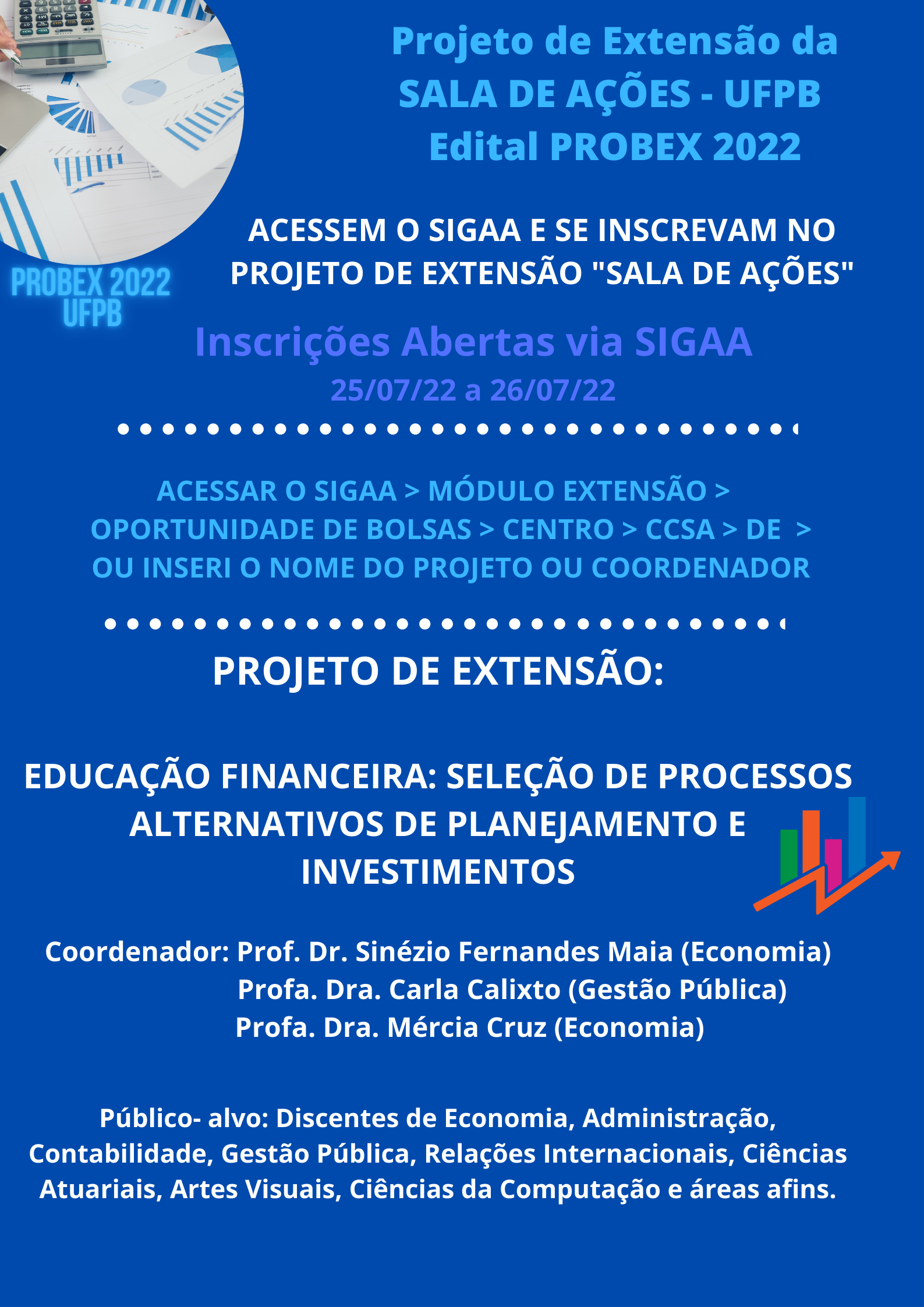 O Projeto de Extensão "Educação Financeira: Seleção de Processos Alternativos de Planejamento e Investimentos" sob coordenação do(a) Profa. Dra. Carla Calixto, Prof. Dr. Sinézio Fernandes e pela Profa. Dra. Mércia Cruz, está com as inscrições abertas via SIGAA no período de 25/07/2022 a 26/07/2022.