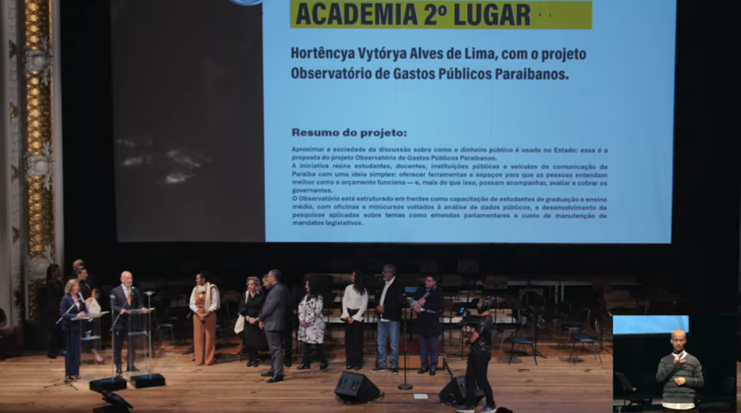 Na categoria Academia, foi premiado, em 2º lugar, o Projeto de Extensão “Observatório de Gastos Públicos Paraibanos”, representado pela aluna do Bacharelado em Gestão Pública Hortêncya Vytórya Alves de Lima, e que tem também como integrantes as alunas Pâmella Silva Souza, Andrielly Christine Silva, Ester Santos Torres, Rayssa Mendes de Souza e o professor Fernando José Vieira Torres (Coordenador).