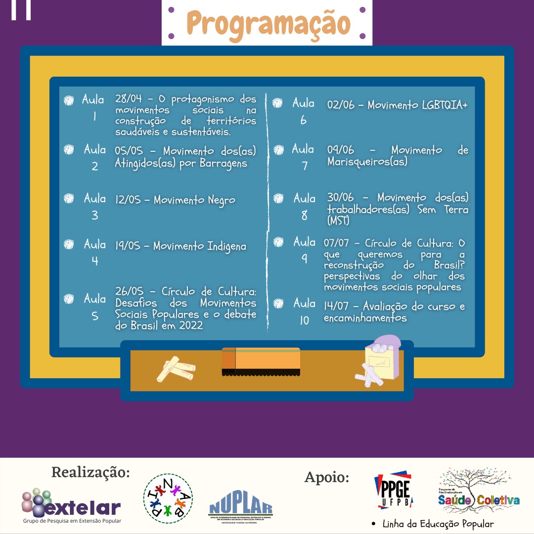 O II Curso de Formação "Movimentos Populares e Práticas Sociais na construção da emancipação humana: conhecimentos, ideias e práticas" promovido pelo Grupo de Pesquisa em Extensão Popular (Extelar) da Universidade Federal da Paraíba (UFPB) contará com um total de 10 (dez) encontros semanais, sendo estes das 18h30 às 20h, com início no dia 28/04/2022, quinta-feira, via remota (Google Meet).
