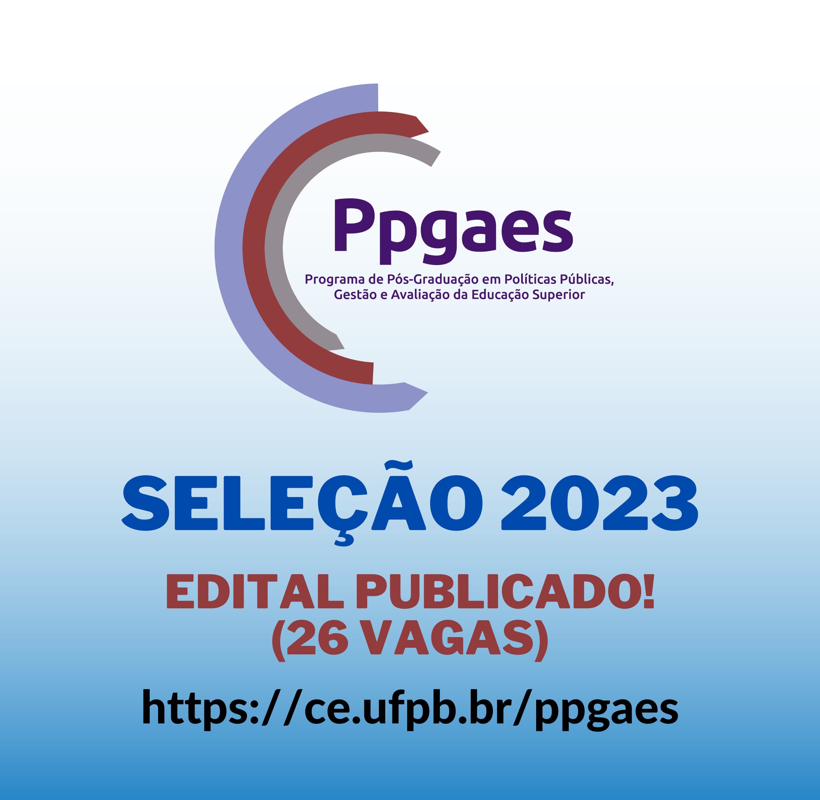 A Coordenação do Programa de Pós-Graduação em Políticas Públicas, Gestão e Avaliação da Educação Superior - PPGAES-UFPB, comunica que estão abertas as inscrições do Processo Seletivo Discente 2023.