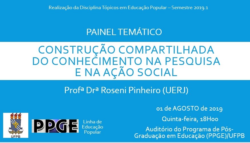Convidamos todas e todos para Painel Temático com a participação da Profª Drª Roseni Pinheiro (UERJ), coordenadora do Laboratório de Práticas e Pesquisas em Integralidade e Saúde, realizado no contexto da disciplina Tópicos em Educação Popular, da Linha de Educação Popular do Programa de Pós-Graduação em Educação (PPGE) da UFPB.