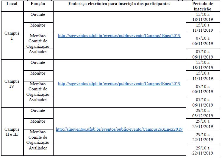 Inscrições Campus I http://sigeventos.ufpb.br/eventos/public/evento/Campus1Enex2019