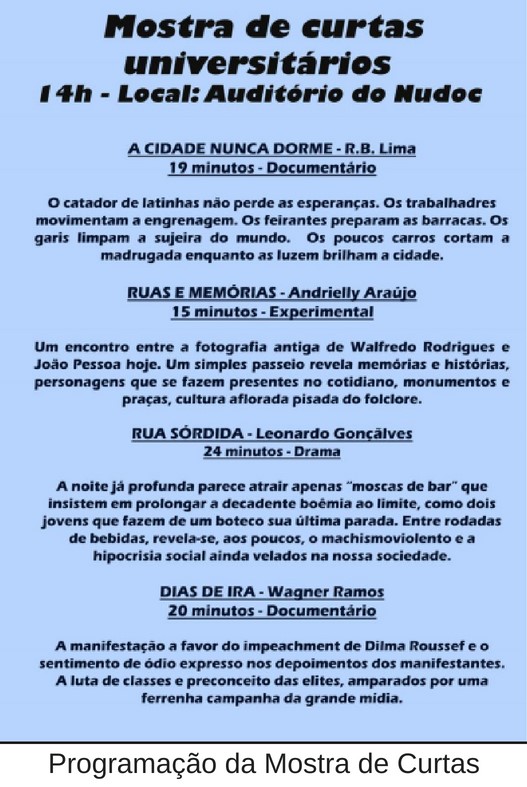 A primeira edição do projeto acontece no dia 24 de maio, com o tema Música, cinema e juventude. O evento iniciará com uma apresentação musical, às 12h, no Centro de Vivência da UFPB, já no Núcleo de Documentação Cinematográfica (NUDOC), também na instituição, ocorrerá a exibição de curtas a partir das 14h.