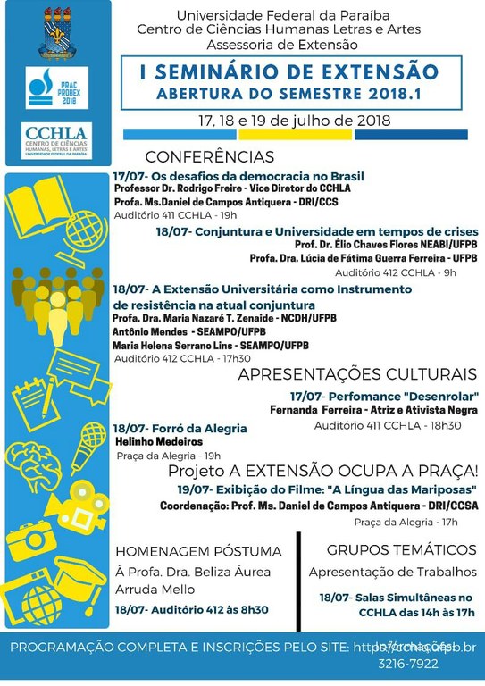 O I Seminário finalizará, no dia 19 de julho, com a exibição do filme “A Língua das Mariposas, pelo projeto “A Extensão Ocupa a Praça”, de coordenação da Assessoria de Extensão do CCHLA. Mais informações podem ser obtidas pelo telefone 32167922 ou pelo e-mail assessoriaext@gmail.com. As inscrições podem ser realizadas pelo link: https://sigaa.ufpb.br/sigaa/public/extensao/loginCursosEventosExtensao.jsf