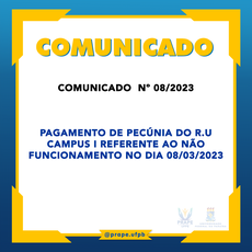 COMUNICADO Nº 08/2023 PAGAMENTO DE PECÚNIA DO R.U CAMPUS I REFRENTE AO NÃO FUNCIONAMENTO NO DIA 08/03/2023