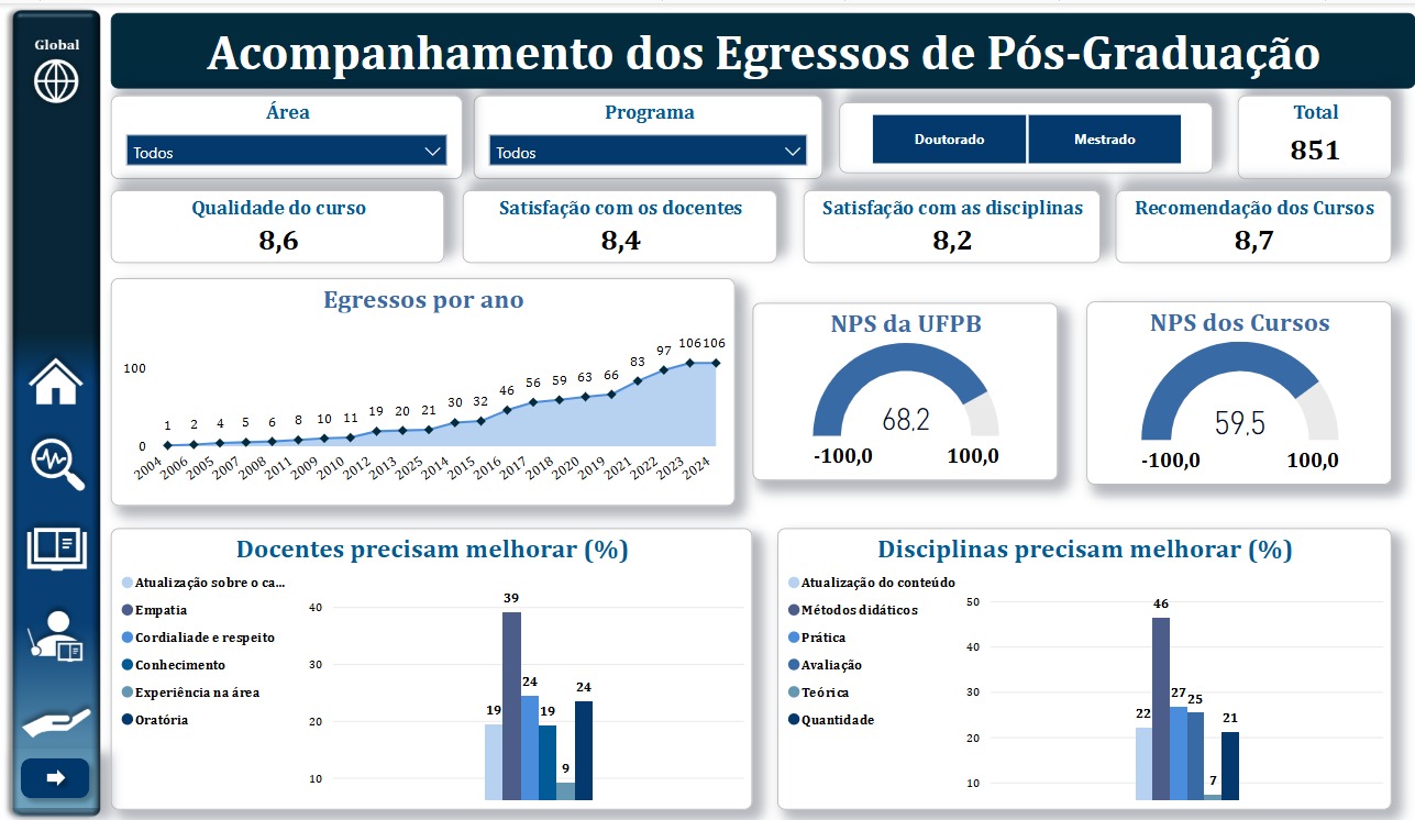 Os resultados preliminares da pesquisa já apontam dados relevantes. Entre os programas que tiveram mais de 100 participantes, o Programa de Pós-Graduação em Linguística (PROLING) se destacou com o maior impacto percebido no sucesso profissional dos egressos (média = 9,3) e o maior índice de recomendação do curso (Net Promoter Score = 84,7%). Além disso, foram identificadas áreas de melhoria para a UFPB, como infraestrutura e desenvolvimento de projetos acadêmicos.