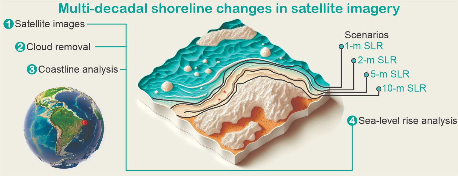 Para chegar a estas constatações, os pesquisadores empregaram uma metodologia com abordagens integradas, na qual foram utilizadas diversas ferramentas, como imagens de satélite, algoritmo para remoção de nuvens das imagens, sistema digital de análise costeira (DSAS, na sigla em inglês) e mapeamento de cobertura e do uso da terra, este último obtido a partir do Projeto MapBiomas.